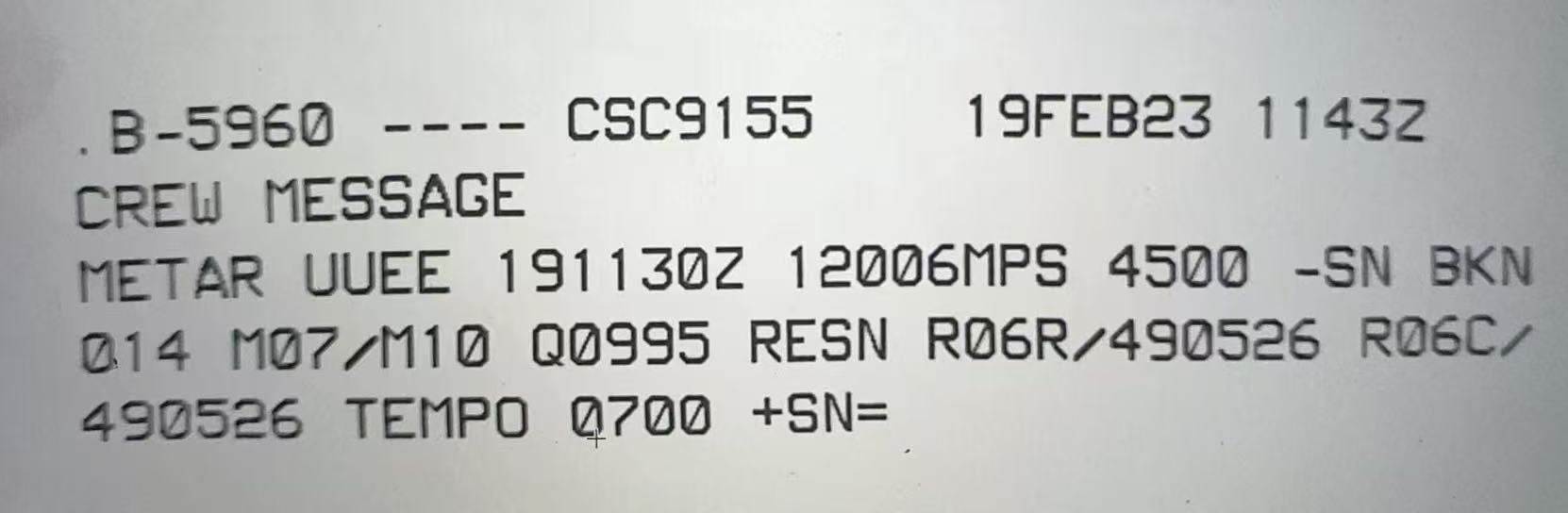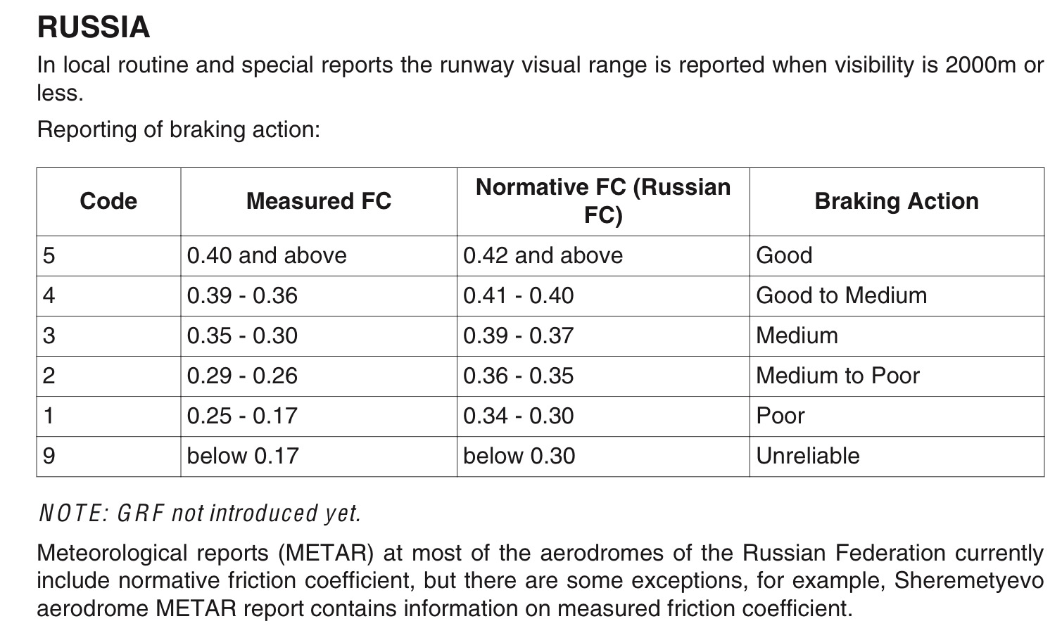 俄罗斯没有使用 GRF,其气象报文是老的 Europe (RODEX) Broadcast Information,没有 RWYCC,只有当地摩擦系数对应的 Code。另外,俄罗斯机场的摩擦系数也有 Measured FC 和 Normative FC 两种。