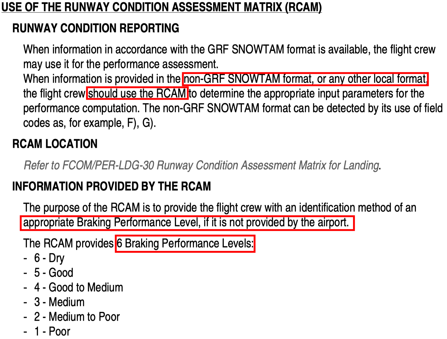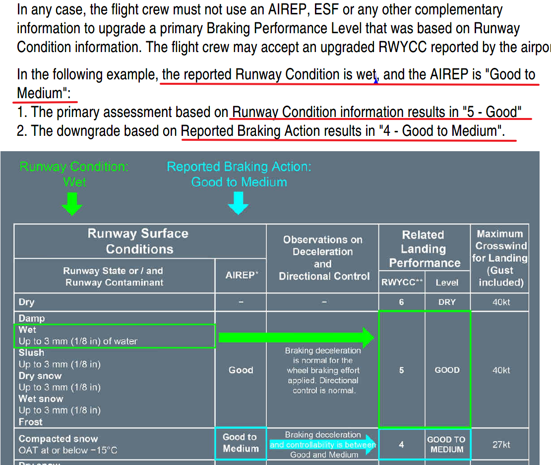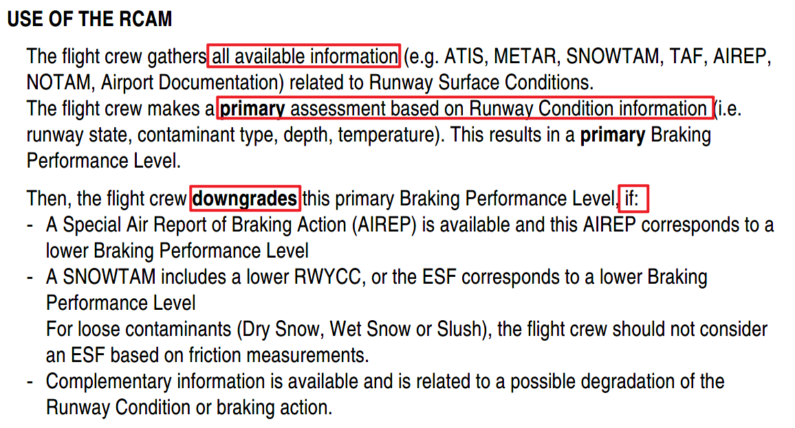 RCAM 就是在没有 GRF 情况下使用的,原理就是用“道面条件”、“刹车效应”、“飞行员报告”等其他信息来对应合适的 RWYCC 和 Braking Performance Levels。