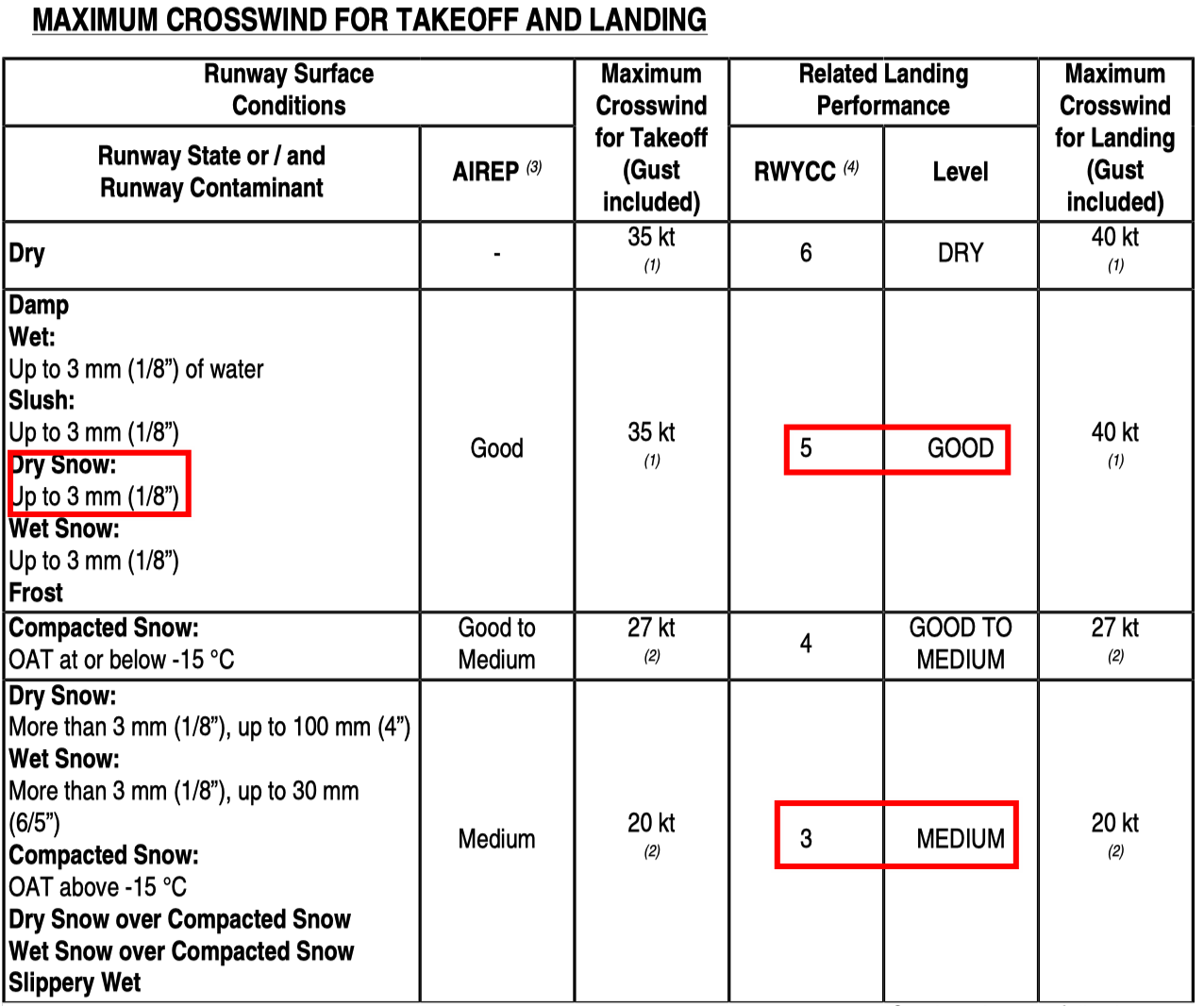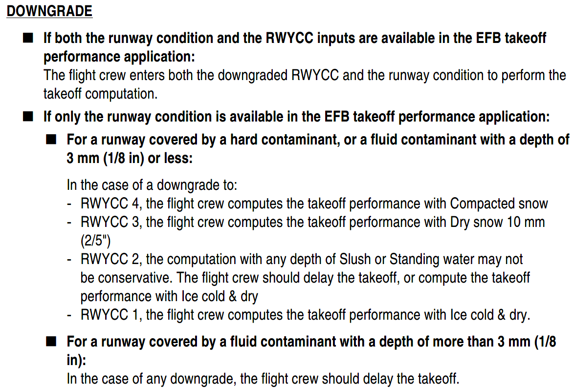 如果按照“干雪 5mm”,在 RCAM 中对应的 Braking Performance Levels 是“MIDIUM”。而 Measured FC 0.26 对应的 braking action 是“MIDIUM TO POOR”。这种情况只能保守处理,使用 MIDIUM TO POOR。