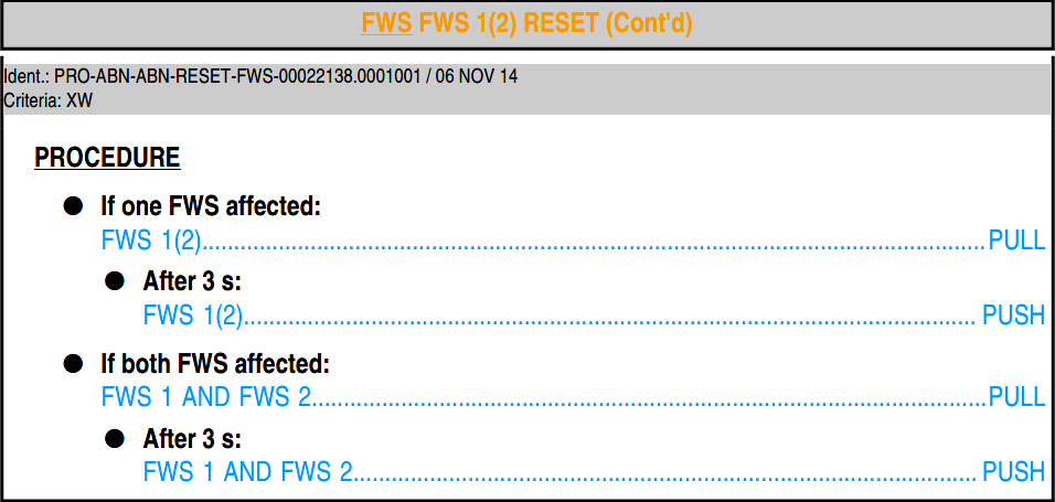 In the case of an ECAM alert, the flight crew will generally apply the ECAM actions before considering the reset table. Sometimes, reset actions are directly included as part of the ECAM procedure (e.g. FUEL FQMS 1+2 FAULT). After application of the ECAM actions, the flight crew may then consider the reset table, taking in account the new status of the aircraft, in comparison with the entries of the reset table.