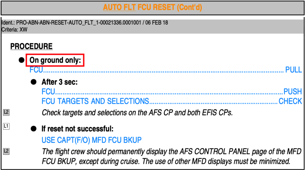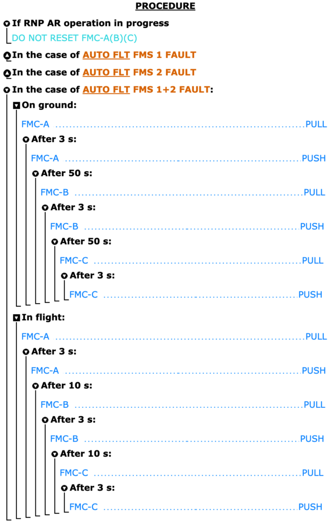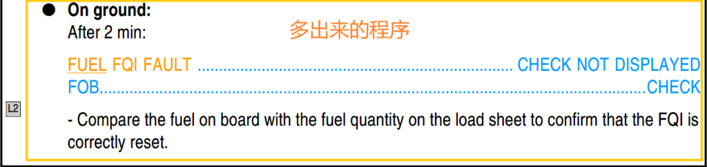 对比具体的复位程序,可以看到,与其他情况(失去显示或者 FQI 故障)所需要的两部复位程序相比,一部复位并不包含在空中 60 秒后复位不成功,以及地面 2 分钟之后的那些程序: