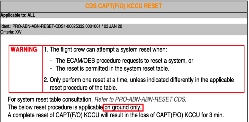进入条件中的“at aircraft power-up”明确了 KCCU 丢失是在飞机通电的时候产生的,而前面也提到复位程序的小字中有“on ground only”的限制。那么,虽然不能在空中复位,地面其他阶段产生的 KCCU 丢失也不能复位么?为什么限制如此苛刻?