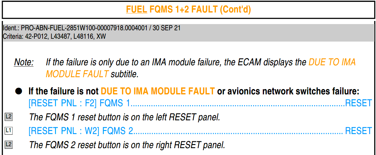 2 FUEL FQMS 1(2) FAULT 和 FUEL FQMS 1+2 FAULT 这两个 ECAM 程序中都直接要求复位,然而,参考其对应的 FQMS 1(2) RESET 程序,却明确写着“on ground only”。那如果空中出现这两个 ECAM 警告,是否能按照 ECAM 进行复位呢?