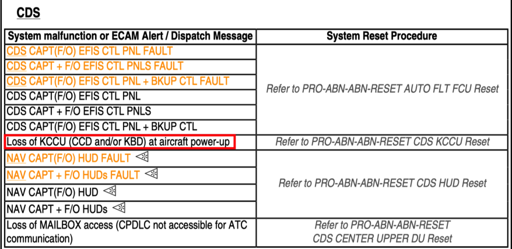 6 CDS CAPT(F/O) KCCU RESET,在 SYS RESET TABLE 中的进入条件是“Loss of KCCU (CCD and/or KBD) at aircraft power-up”。意思是该复位仅适用于通电过程中的 KCCU 丢失。这个条件也太具体和苛刻了,那其他时候的丢失,比如滑行中、空中等就不能复位么?为什么?