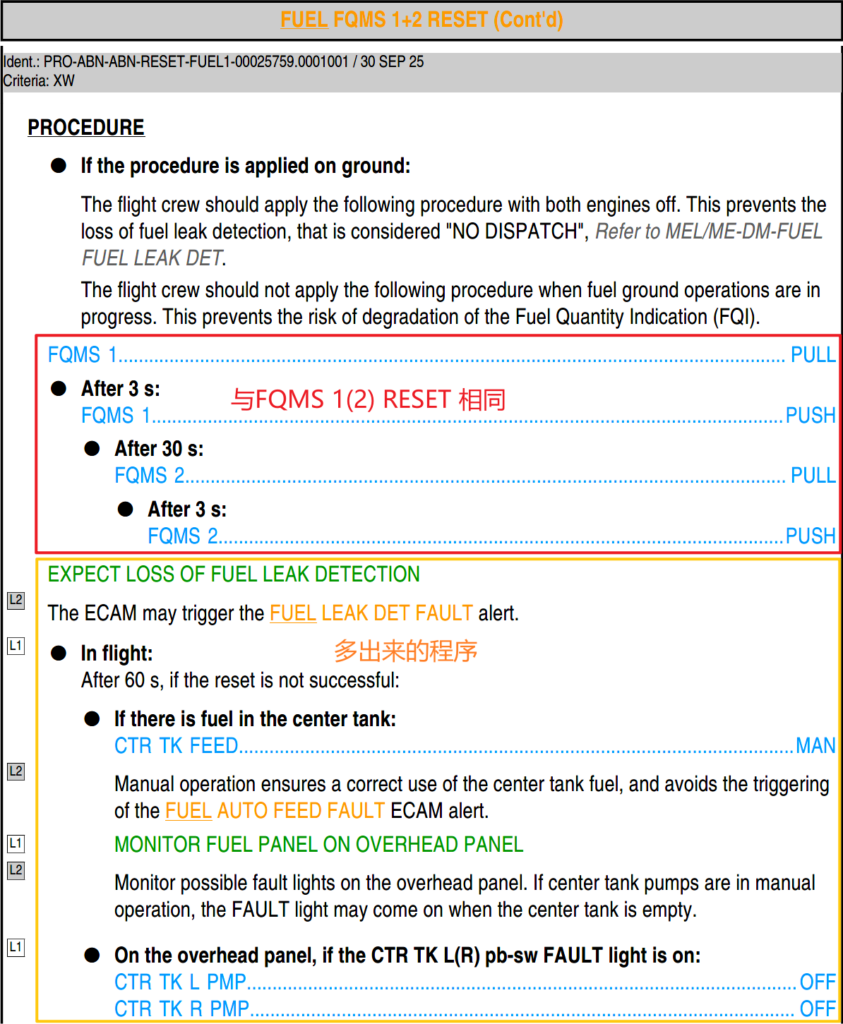 所以,目前能得到的结论就是,对于 FQMS 来说,可以按 ECAM 程序复位,但如果复位不成功,到了状态页再参考复位表,就只能在地面复位了。