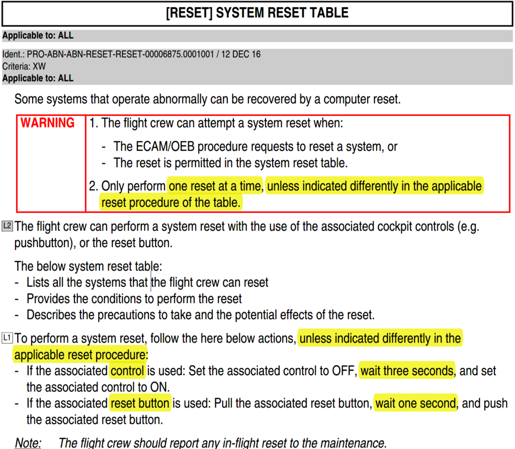 系统复位可以用来解决某些计算机问题,在 ECAM 做到状态页的时候需要考虑,这一点大家应该都比较熟悉。然而,如果细看所有的复位程序及其要求,会发现一些很令人疑惑的地方,比如: