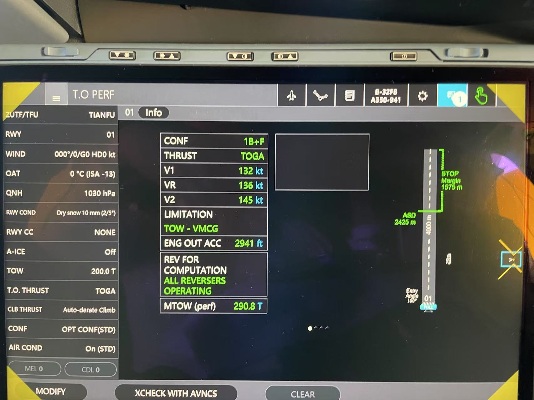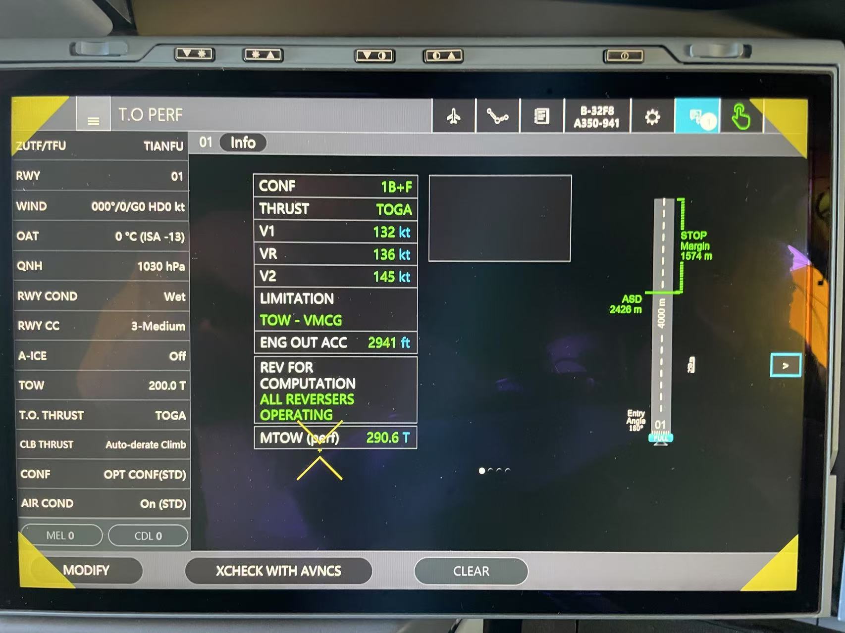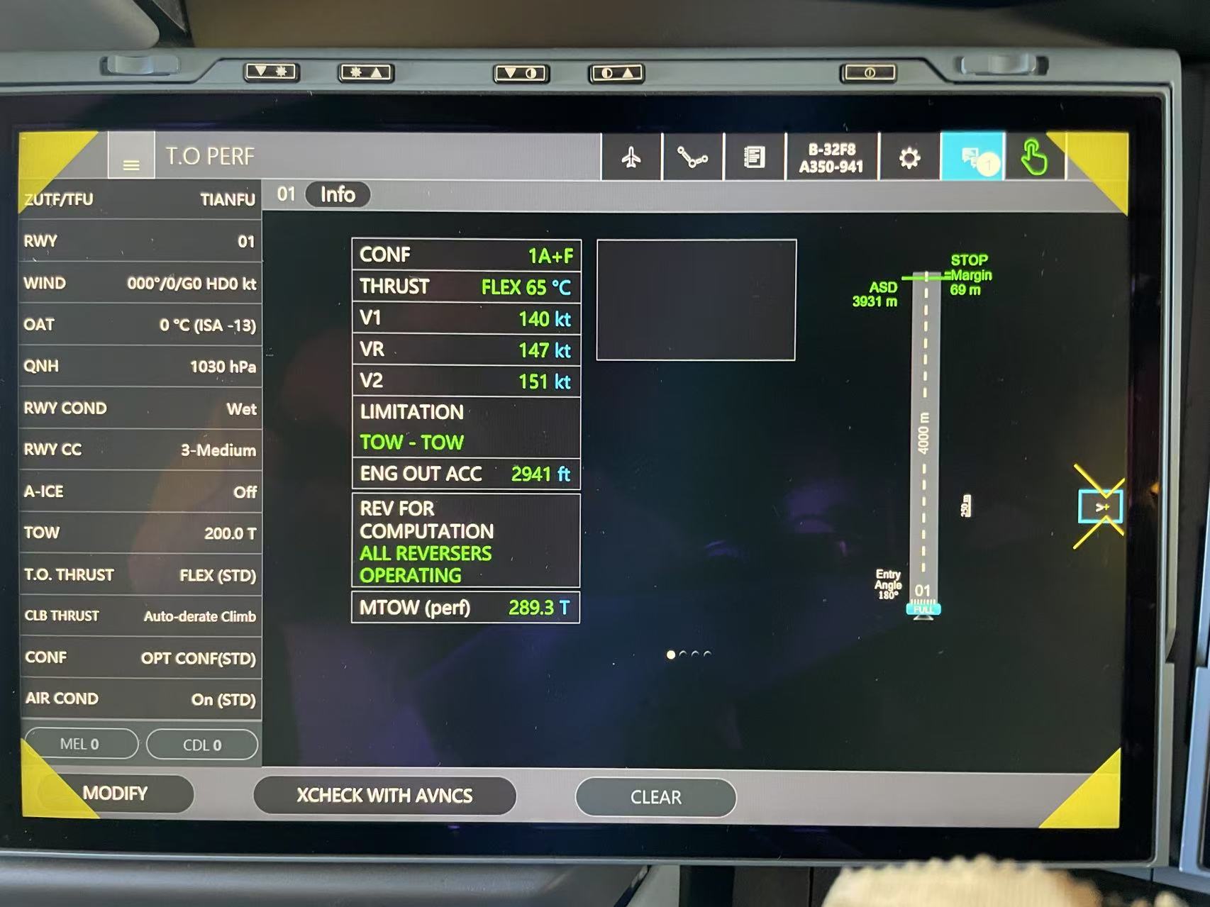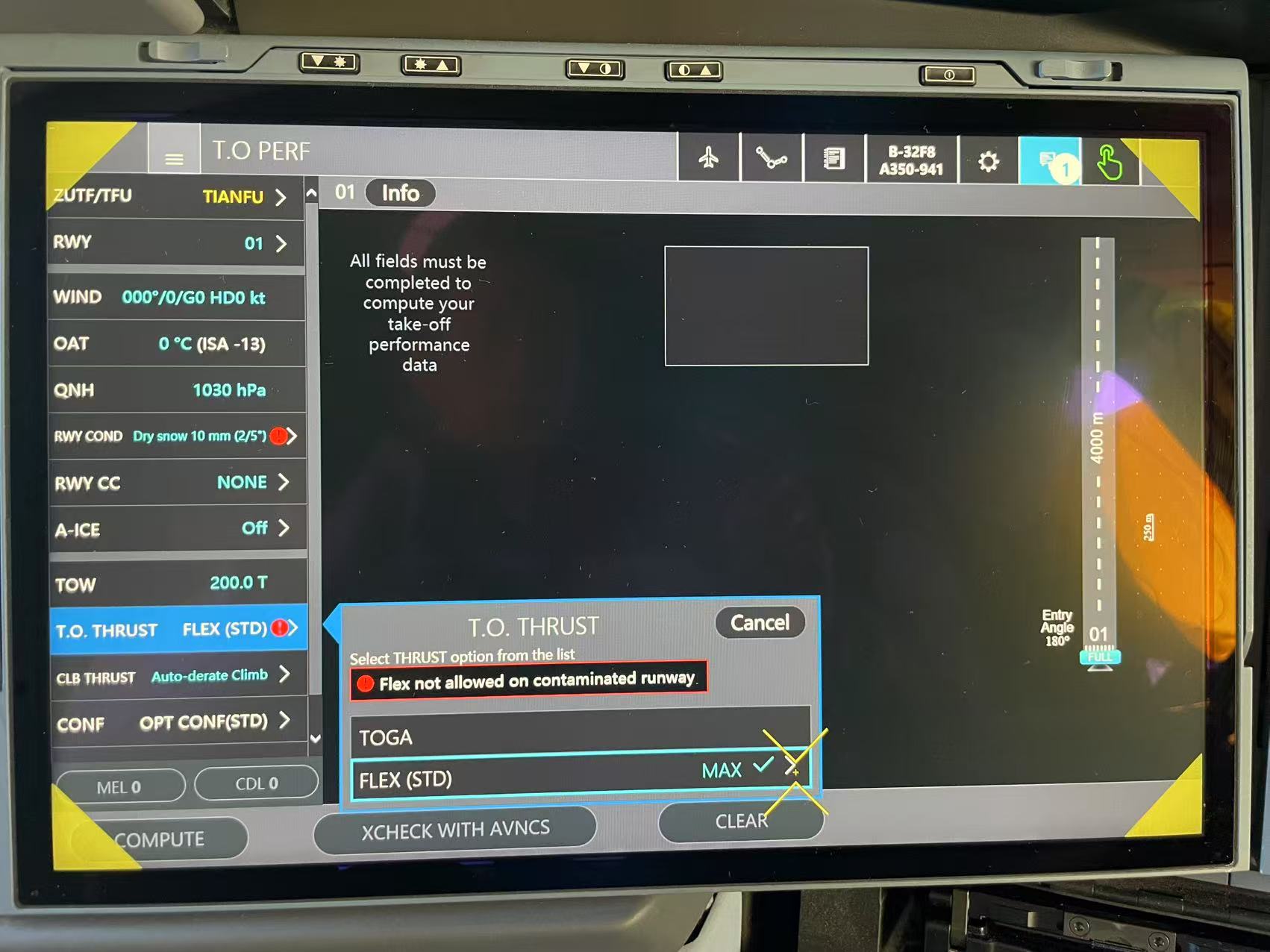 这意味着在这种降级情况下,使用 TOGA 才能获得合理的性能。如果按照 Flysmart 降级算出来的 FLEX,裕度非常小。这也与法规要求“污染跑道必须使用 TOGA 起飞”一致。