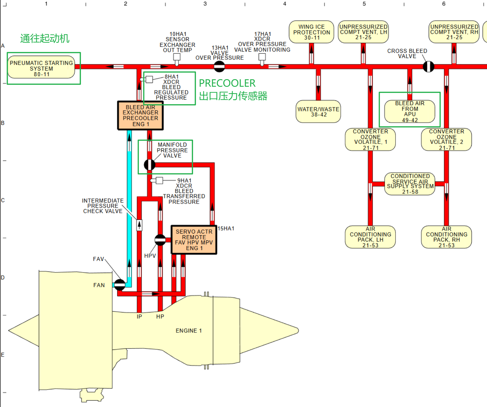 可以看出,地面高压气源是在 APU CHECK VALVE 的下游,和 APU 引气是走同一根管道接入引气系统的。发动机引气活门(机务图中的 MANIFOLD PRESSURE VALVE)是在 PRECOOLER 的上游,PRECOOLER 出口压力传感器是在下游。