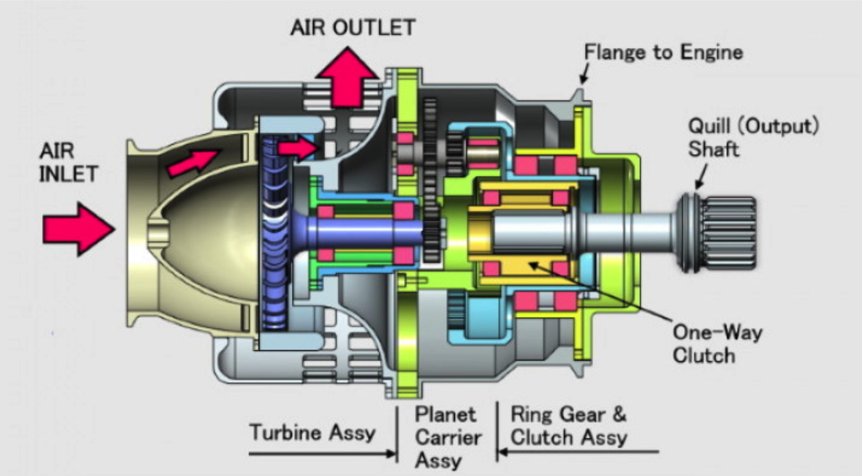 起动机利用外部气源(或电能)产生机械功率,经齿轮与单向离合器驱动发动机高压转子加速至可建立稳定燃烧的转速,并在发动机自持运转后自动脱开。
