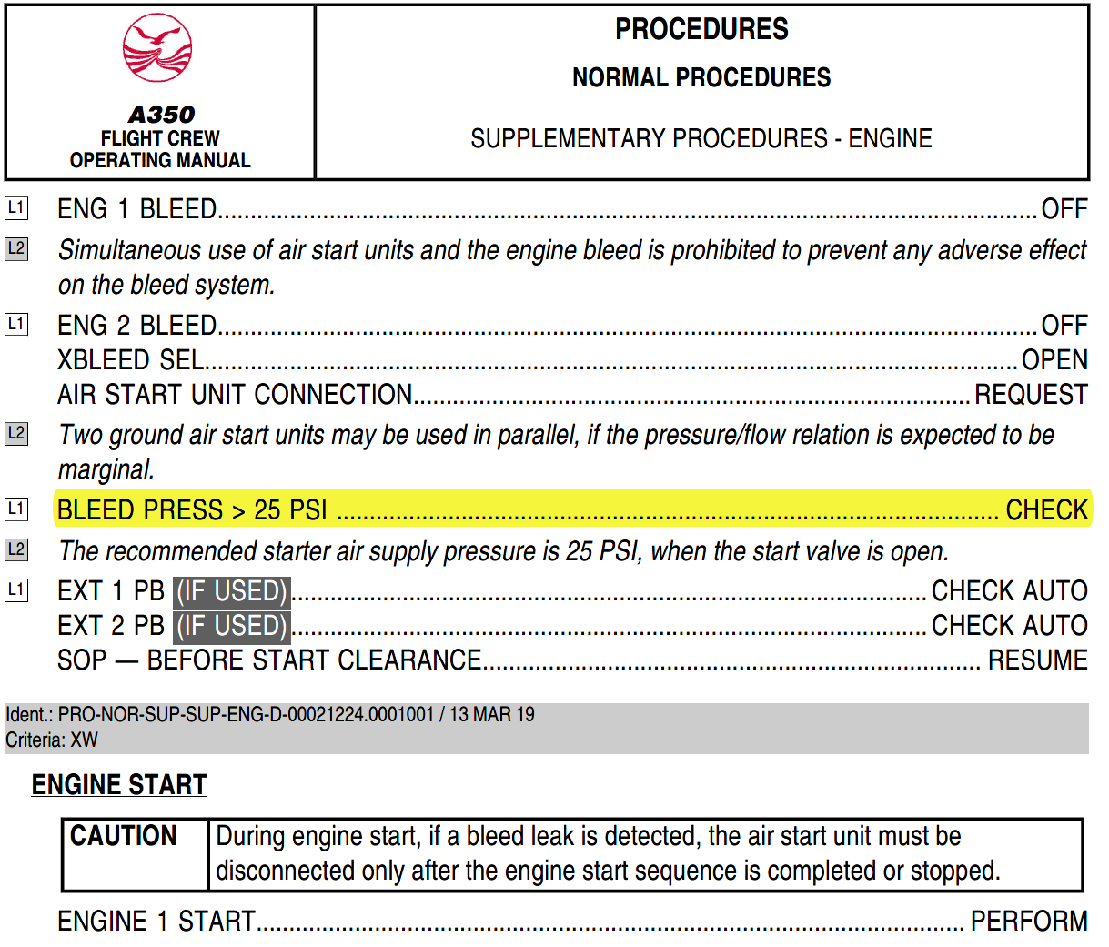 在 FCOM PRO-NOR-SUP-SUP-ENG D ENGINE START WITH AN AIR START UNIT 部分,只提到要检查 BLEED PRESS > 25 PSI,没有说在哪里检查:
