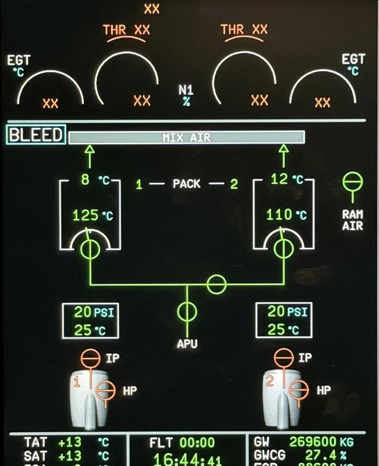 在地面使用 APU 引气时的 BLEED SD 是这样的: